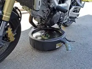 Найдите масляный фильтр под мотоциклом и подставьте под него поддон для отработанного масла, чтобы поймать стекающее масло.