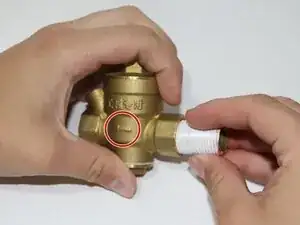 Накрутите штуцер на регулятор, убедившись, что стрелка (обозначенная красным кругом) указывает от штуцера.