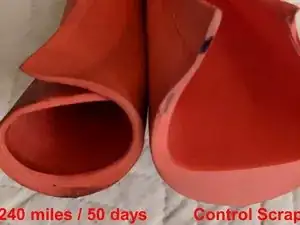 Через 50 дней и 385 км эксплуатации произошёл очередной прокол. Броня заметно сжата. Прокол расположен на боковине — типичный прокол от зажима.