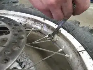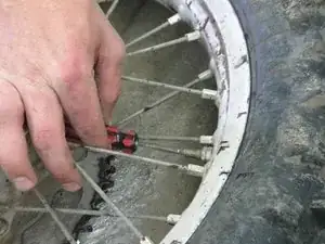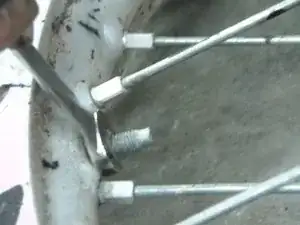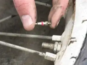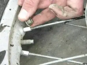 Колесо теперь снято. Теперь снимите сердечник вентиля с покрышки с помощью ключа для сердечников и выпустите весь воздух. Используйте гаечный ключ 12 мм и снимите гайки с вентиля и с фиксатора борта. Фиксатор борта — это другой элемент в ободе с гайкой, кроме вентиля.