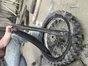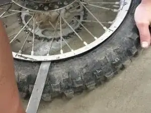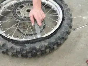 Затем возьмите монтажную лопатку для кроссового мотоцикла и вставьте её между ободом и покрышкой. Как только лопатка зафиксирована, используйте рычаг от обода, чтобы подтянуть покрышку вверх и отвести её.