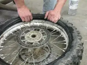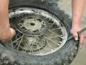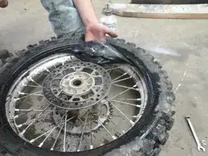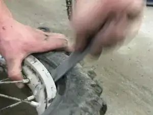 После того как весь воздух вышел, нужно оторвать борт покрышки от обода с обеих сторон. Просто надавите, чтобы шина отошла от обода. Затем распылите мыльную воду между ободом и покрышкой по всему периметру с обеих сторон. Затем вставьте монтировку между ободом и покрышкой. Как только монтировка зафиксируется, используйте рычаг от обода, чтобы подтянуть покрышку вверх и отвести её в сторону.