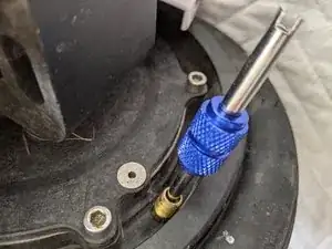 Используйте инструмент для демонтажа, чтобы вынуть сердечник автомобильного вентиля (Schrader) и сбросить оставшееся давление в камере.