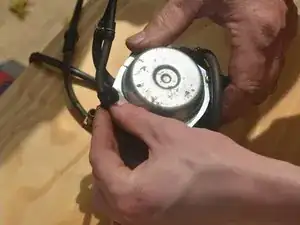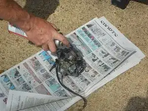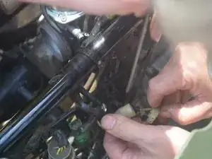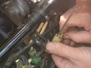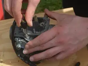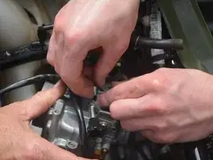 Поверните пружинный механизм, расположенный под снятой чёрной крышкой, чтобы ослабить и вывести трос дросселя изнутри карбюратора.