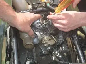Используйте плоскую отвёртку, чтобы поддеть и вывести заклёпки, крепящие обе боковые панели, чтобы получить удобный доступ к карбюратору.