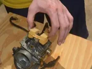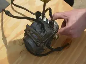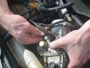 Снимите трос воздушной заслонки, прикреплённый к карбюратору, провернув карбюратор, чтобы выкрутить трос.
