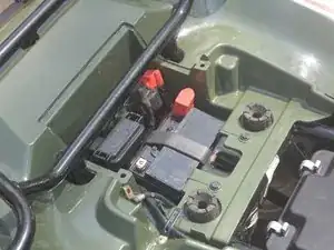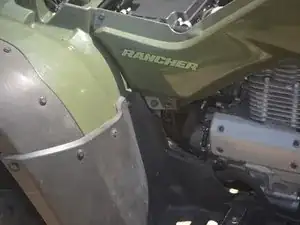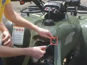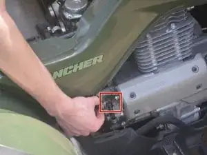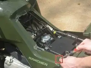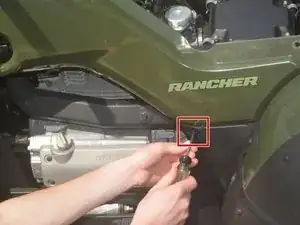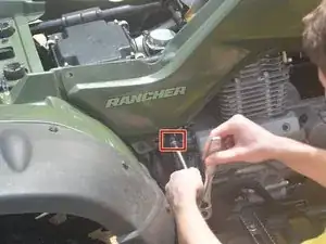 Используйте ключ с головкой на 10 мм, чтобы снять шестигранный болт, который крепит зелёную пластиковую панель с правой стороны квадроцикла.