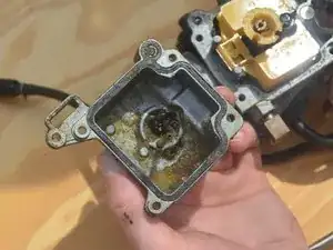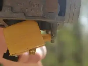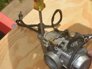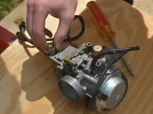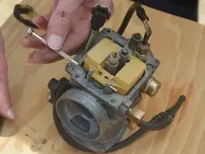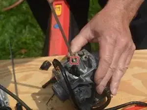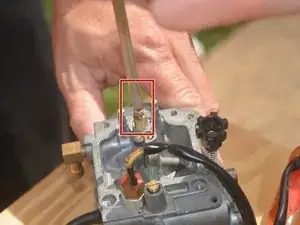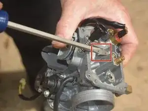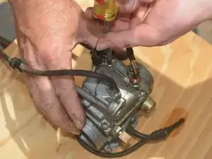 Используйте крестовую отвёртку, чтобы выкрутить два винта, удерживающие пример‑узел на карбюраторе.