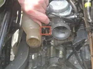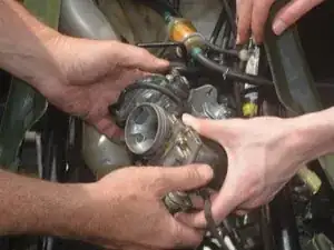 Используйте трещотку с головкой на 10 мм, чтобы ослабить хомут, соединяющий карбюратор с впускным коллектором.