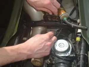 Снимите пластиковую заклёпку, соединяющую воздуховод с металлической рамой квадроцикла.