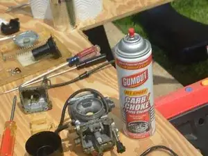 Тщательно распылите очиститель карбюратора по внешней поверхности, внутренностям и отверстиям карбюратора.