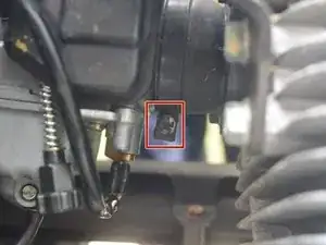 Используйте крестовую отвёртку, чтобы выкрутить винт, крепящий чёрную крышку с правой стороны карбюратора.