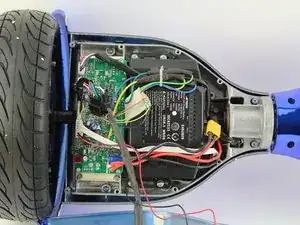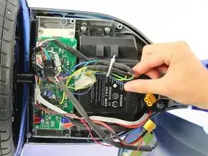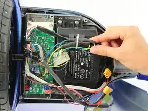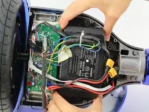 Вытащите аккумулятор из гироскутера, подняв его и затем выдвинув из-под проводов.
