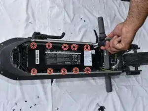 Поместите новый аккумулятор в корпус и снова установите 10 винтов (если необходимо), закрепив аккумулятор на самокате.