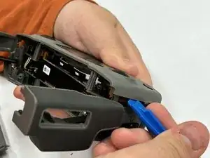Вставьте инструмент для открытия, чтобы отделить небольшой пластиковый элемент от основного корпуса пульта, который был раскручен на предыдущем этапе.