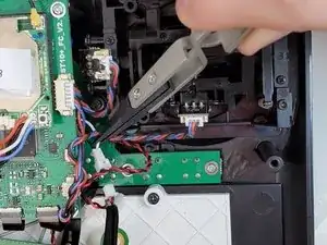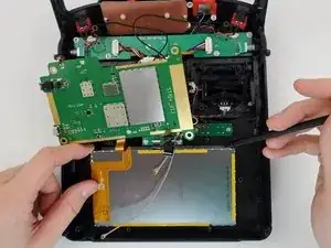 Возьмите плоский конец лопатки и поместите его под белый фиксатор ZIF-разъёма ленточного кабеля. Поднимите белый фиксатор, чтобы освободить ленточный кабель.