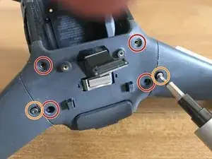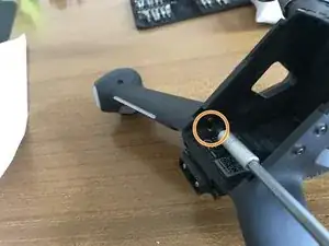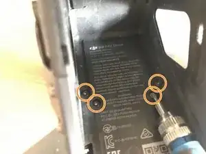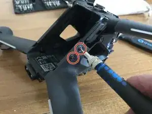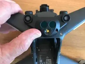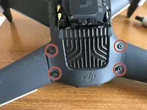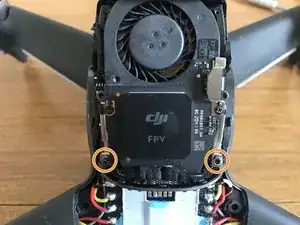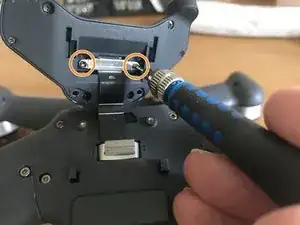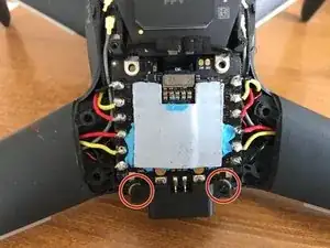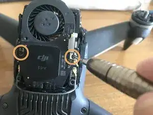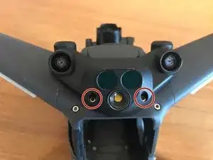 Стоя лицом к задней части дрона, снимите два винта, фиксирующие блок оптического датчика.