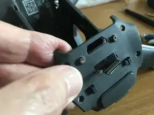 Снимите по винту с каждой стороны блока GPS. У этих винтов очень тонкие головки Phillips, мельче, чем 000. Одна из головок может быть покрыта чёрным покрытием, которое следует соскоблить.