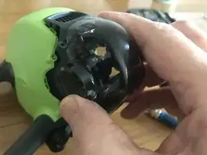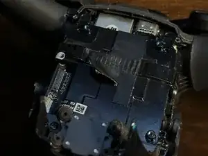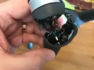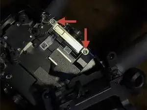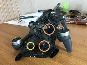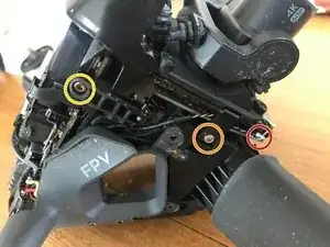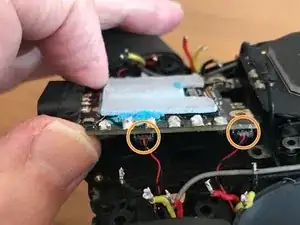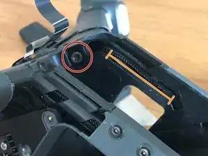 Снимите два защёлкивающихся разъёма под скобой, затем аккуратно оторвите чёрную липкую ленту, чтобы можно было вынуть гимбл с кабелем.