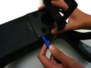 Когда все три винта будут ослаблены, используйте меньший пластиковый инструмент для открытия, чтобы аккуратно поднять панель, закрывающую карданный подвес, поместив квадратный конец инструмента в щель между панелью и остальной частью устройства.