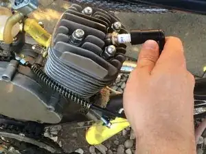 Отсоедините резиновый наконечник CDI от свечи зажигания, аккуратно потянув вверх и от двигателя.