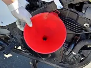 Залейте 3.6 кварты (около 3,4 литра) масла 10W-40 для мотоциклов в двигатель. Одной рукой стабилизируйте воронку, чтобы избежать проливов.