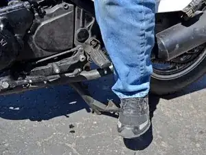 Используя левую ногу, нажмите на среднюю опорную лапку и наклоните мотоцикл назад, чтобы установить его на центральную подставку.