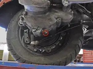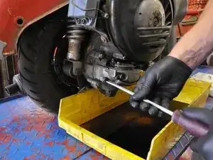 Важно, чтобы скутер оставался ровным во время заливки; если он наклонён в одну или другую сторону, Вы перелили или недолили масло. Масло может стечь по боковой части двигателя — это нормально, просто протрите его после окончания работы.