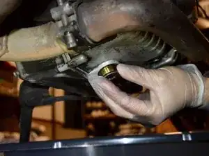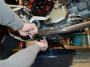 Сначала подставьте невысокое ведро прямо под шестигранный пробочный болт, расположенный под мотоциклом.