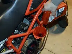Когда масло почти перестанет течь, наклоните мотоцикл влево и вправо, чтобы убедиться, что из двигателя вышло всё масло, как показано на втором изображении.