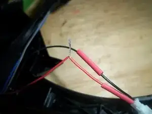 Наденьте небольшой кусок термоусадки длиной около 14 мм на провод, совместите чёрный с чёрным и красный с красным и скрутите провода вручную.