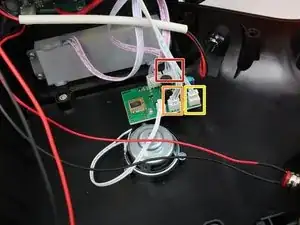 Отсоедините четырёхконтактный разъём красного и белого проводов от платы динамика.