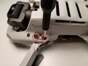 Разверните дрон так, чтобы пропеллеры были направлены вверх ногами, и удалите два винта J000 длиной 3,5 мм с заменяемого несущего луча.
