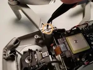 Переверните дрон и с помощью пинцета надавите на металлическое ядро штифта несущего луча.