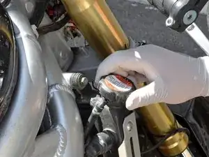 Когда слив замедлится до капли, поднимите мотоцикл в вертикальное положение, чтобы дать возможность стечь последней охлаждающей жидкости.
