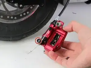 Снимите механизм тормоза и переверните его, чтобы увидеть болт, удерживающий тормозной провод.
