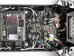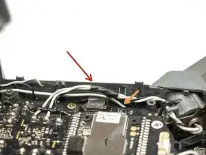 На верхней части дрона аккуратно освободите связку кабелей задней ножки из её клипа для укладки кабеля