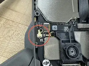 На нижней стороне дрона найдите чёрный кабель, показанный в красном круге. Если вы снимаете передний правый рычаг: ищите чёрный кабель. Если снимаете передний левый рычаг: ищите белый кабель. Оба кабеля находятся относительно близко друг к другу.