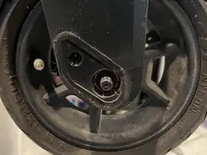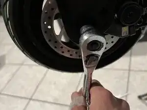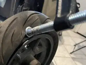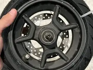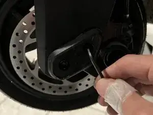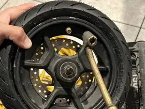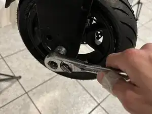 Установите колесо обратно на самокат, используя торцевой ключ на 15 мм, и затяните болт с обеих сторон.