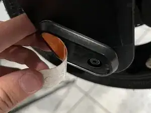 Найдите наклейку на правой стороне передней шины, затем начните нагревать её горячим воздухом фена, чтобы размягчить клей.