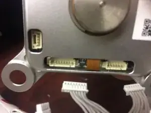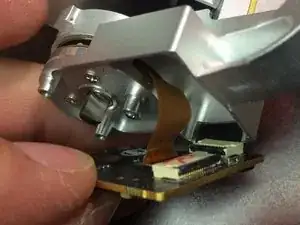 Далее нужно отклеить шлейф от поворотного рычага. Он липкий, но не слишком. Рекомендую использовать фен, чтобы немного нагреть и размягчить клей.