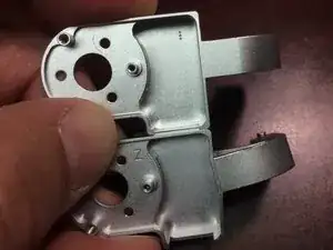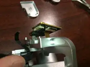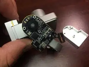 Поднимая детали, действуйте очень аккуратно, поскольку к плате камеры прикреплён шлейф. Металлические пластины откидываются в сторону, и подвес разделяется на две части.