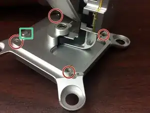 Снимите четыре винта с крестообразным шлицем на нижних пластинах. Здесь две пластины по два винта в каждой. Будьте осторожны, чтобы не потерять кнопку на нижней части подвеса.