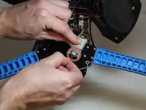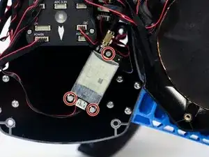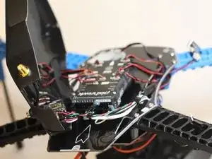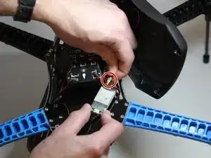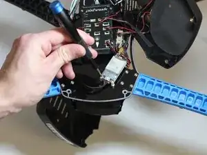 С помощью крестовой отвёртки Phillips #1 отверните три винта 5 мм, крепящие приёмный передатчик (RX) к конструкции дрона.