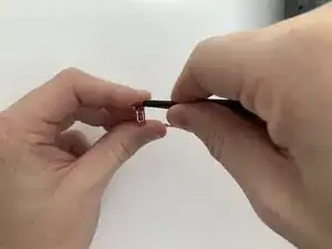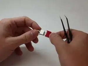 Зажмите пружину изогнутым пинцетом, установив её в вертикальное положение. Затем нажмите вниз на пружину, чтобы освободить её из порта, к которому она прикреплена.