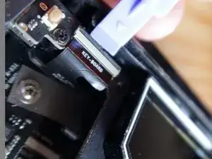 Поднимите маленький фиксатор и отсоедините гибкий шлейф клавиатуры.