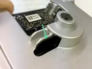 Вставьте металлическую лопатку между шлейфом и блоком управления в указанном месте, чтобы освободить клей.