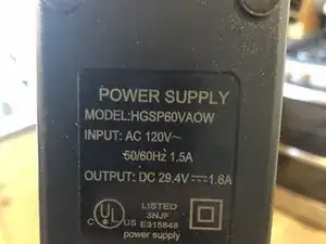 Мы можем взглянуть на блок питания и увидеть, что 1) он обозначает, что это 29.4 Вольт постоянного тока, и 2) + соединяется с контактом #1, а - с контактом #2 (и контакт #3 не используется).
