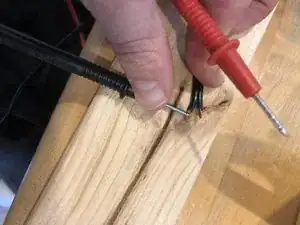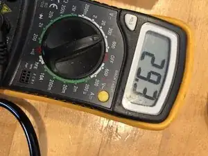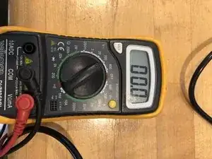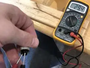 После повторного подключения питания протестируйте, вставив два щупа мультиметра в правильные контакты. Вы видите на этом изображении, что красный щуп касается верхнего левого, а черный - верхнего правого. Как и ожидалось, мы видим положительные 29.4 вольт. Это хороший тест, и мы закончили.