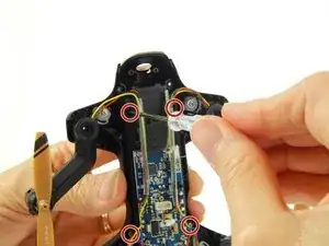 Снимите два винта Phillips #000 длиной 4,9 мм, крепящие камеру к передней части корпуса дрона.